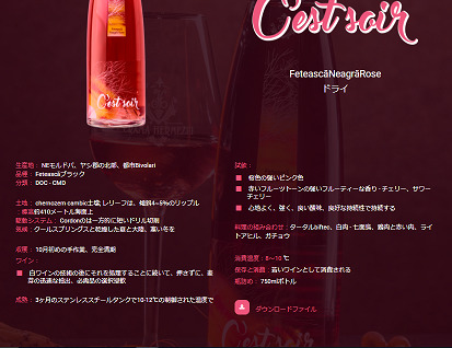ワインテスティング:激しいピンク色でサクランボに近い色です。強烈なフルーティーな香り/赤い果物の色合いで、チェリーの香り/口当たりの良い味/ほどよい酸味で、良好な持続性