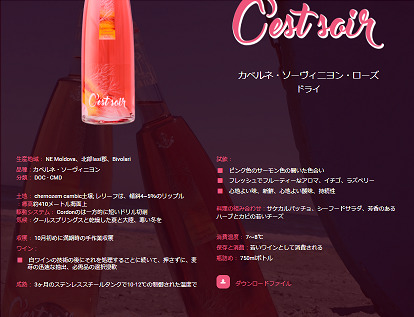 ワインテスティング:サーモンピンク色、明るい色合い/新鮮な風味/フルーティー/ストロベリーとラズベリーのフレーバー/上品で新鮮な味/ほどよい酸味で、非常に持続性が高い